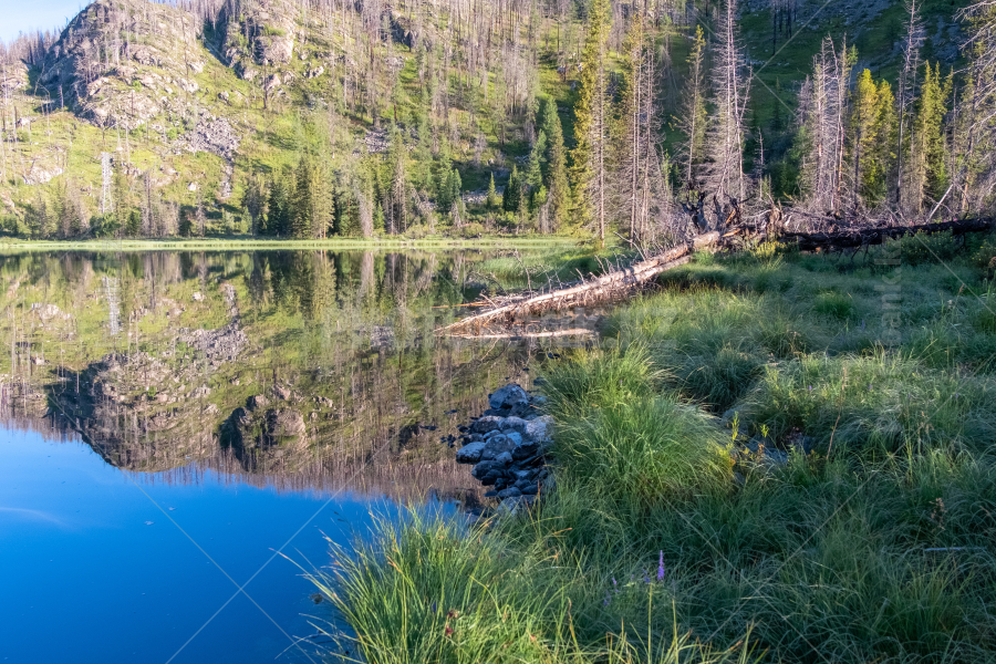 Озеро Рахмановские ключи. Горы отражаются в воде.