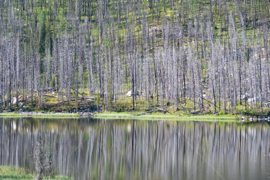 Озеро Рахмановские ключи. Засохшие ели отражаются в глади воды.