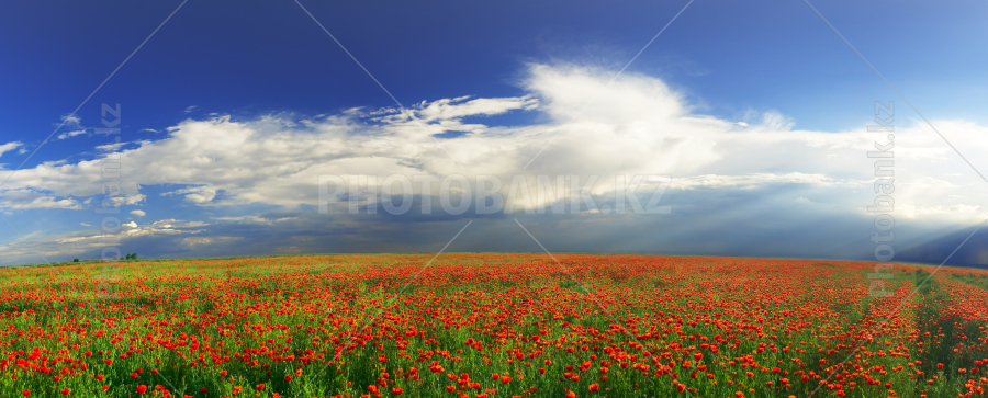 panorama of blossoming poppies and stormy sky