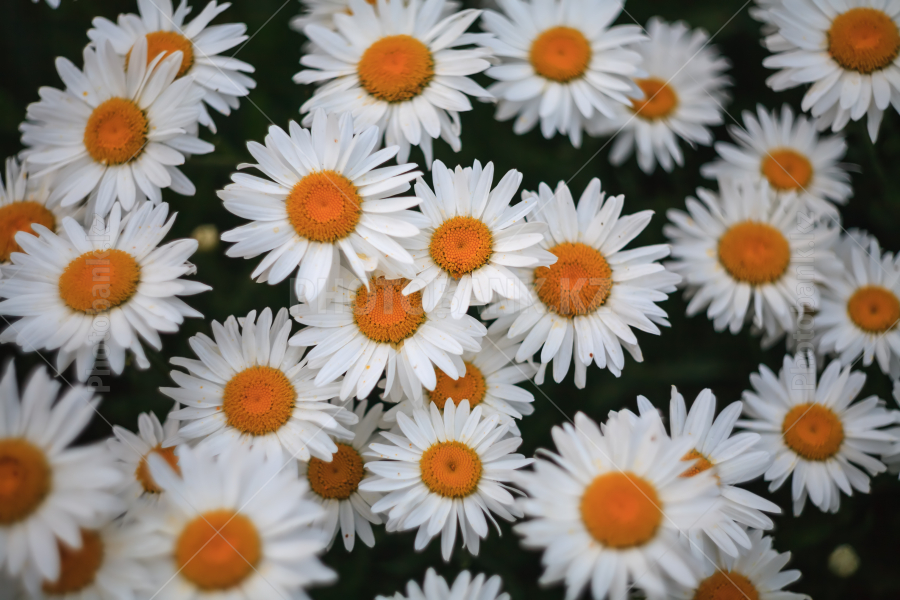 Many chamomile flowers in soft lighting.
