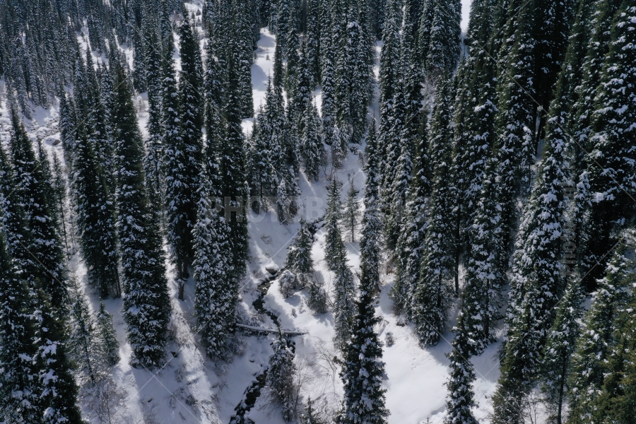 Склоны гор Заилийского Алатау, поросшие тяньшанскими елями. Вид с высоты птичьего полёта.