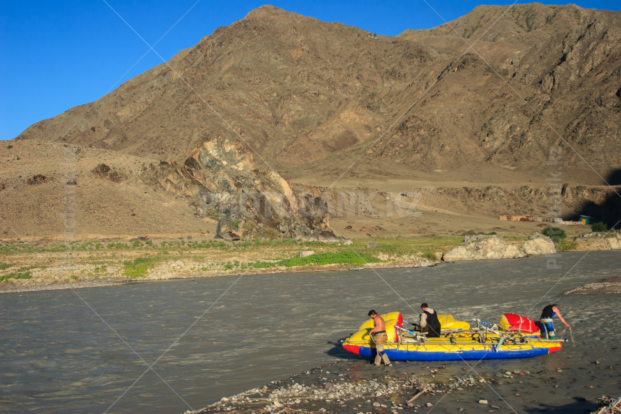 Participants of the extreme rafting moored to the shore. Chilik River, Kazakhstan.