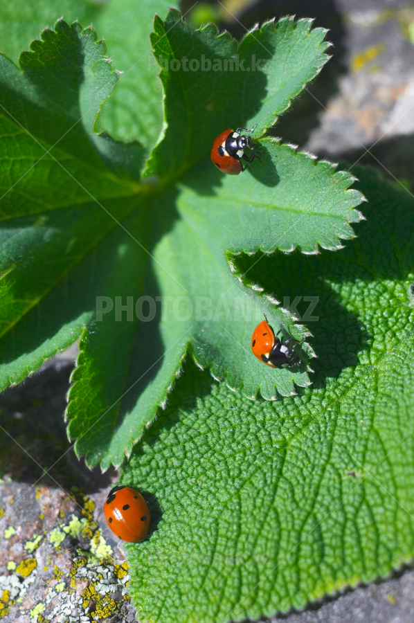 Three ladybirds on green leaves. Coccinellidae Latreille