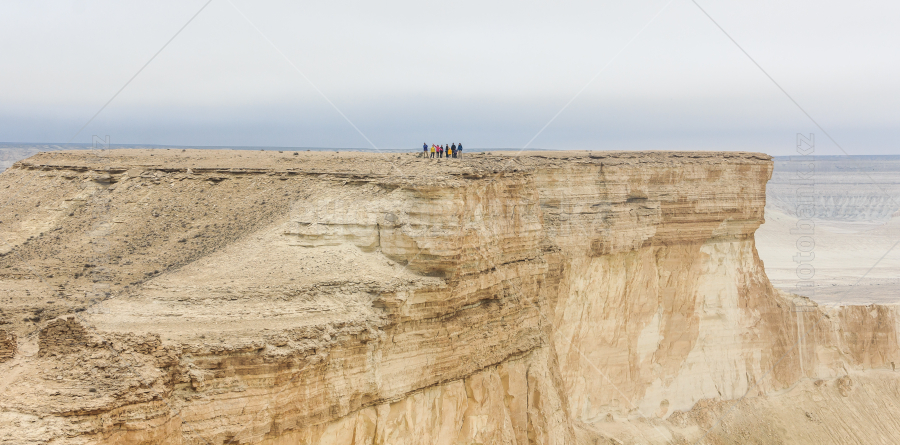 People stand on top of a flat summit. Boszhira tract, Mangystau, Kazakhstan.