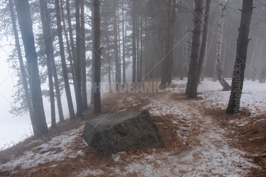 Лесная тропа в предгорьях Заилийского Алатау. Зима, туман, окрестности Алматы.