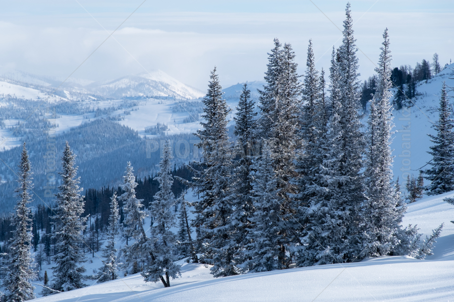 Склоны гор Заилийского Алатау, поросшие тяньшанскими елями. Зима. Окрестности Алматы.