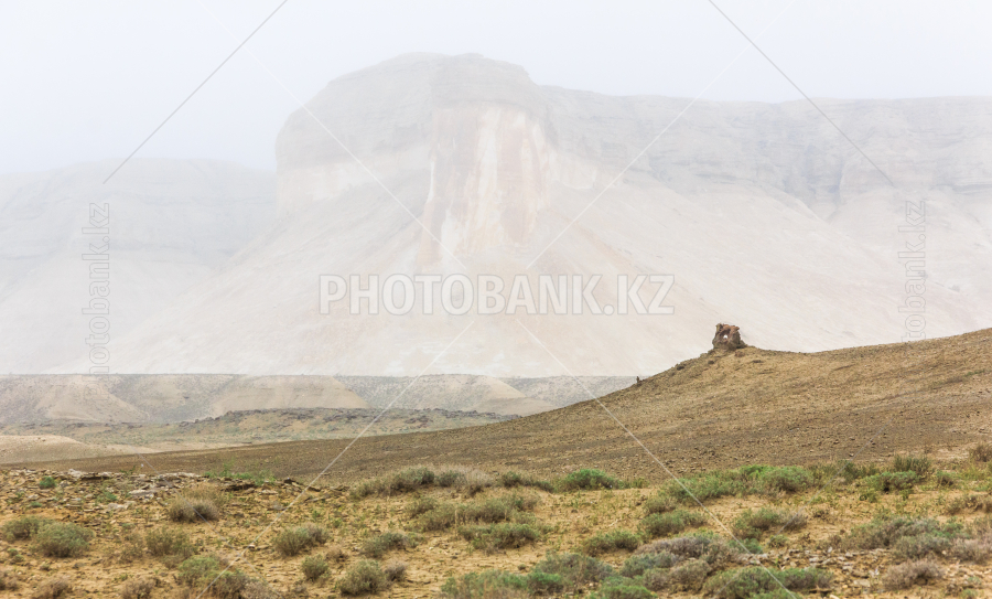 Отвесная скалистая стена в тумане. Мангистау. Казахстан