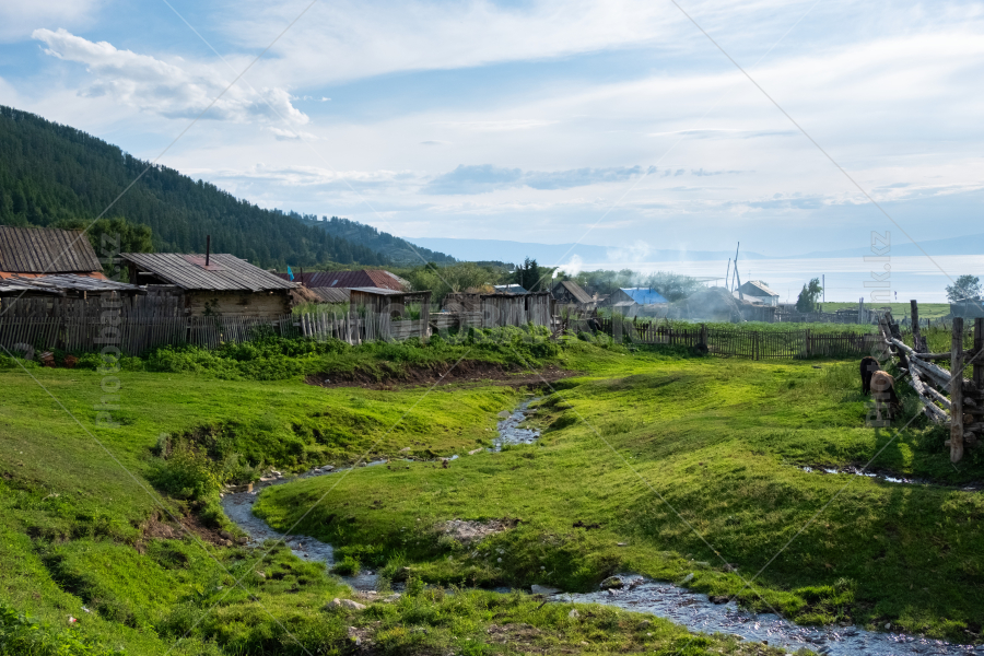 Деревня Урунхайка. Деревянные дома и заборы. Ручей и огороды.