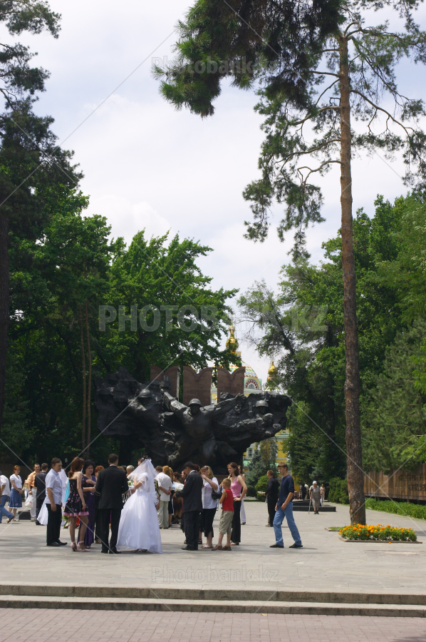 Almaty. Kazakhstan. Park named by 28 Panfilov's guardians. Wedding, people who came to honor the memory of the victims.