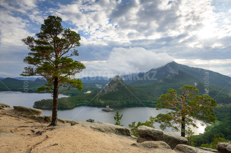 Borovoe lake. "Okzhetpes" rock and "Zhumbaktas" island. National park Burabay. Kazakhstan.