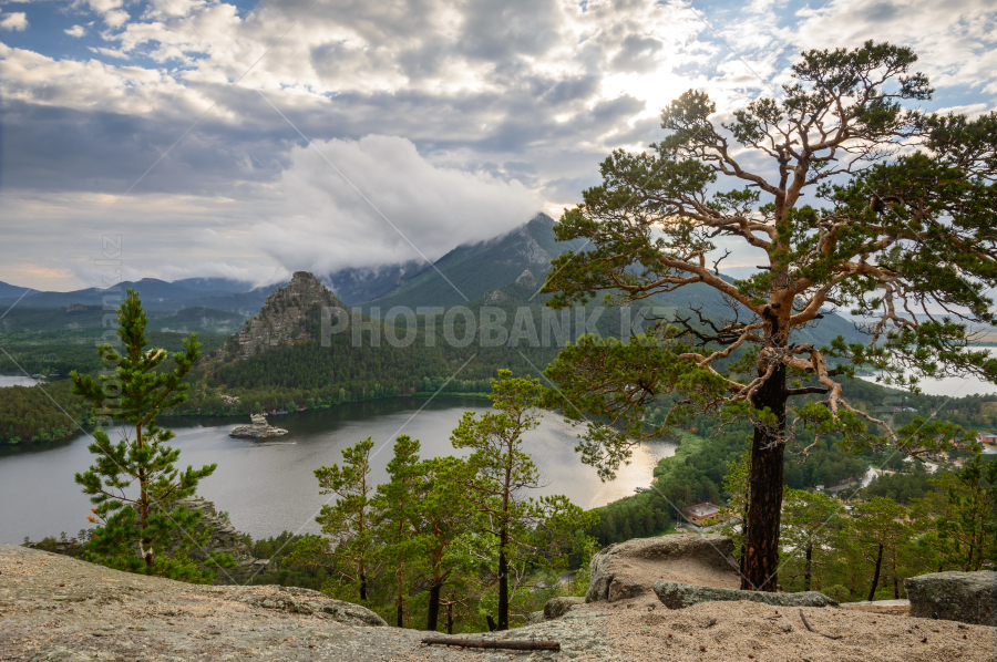 Borovoe lake. "Okzhetpes" rock and "Zhumbaktas" island. National park Burabay. Kazakhstan.