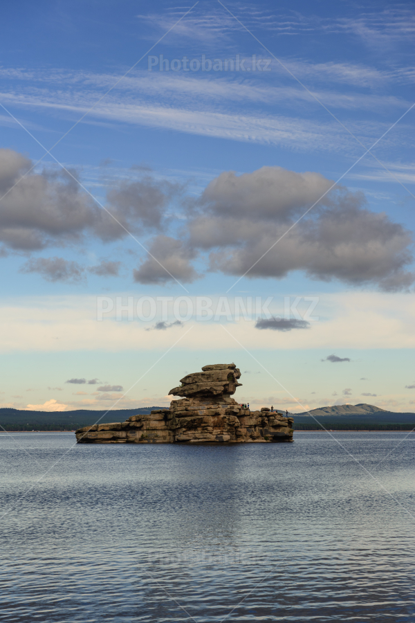Borovoe lake. "Okzhetpes" rock and "Zhumbaktas" island. National park Burabay. Kazakhstan.