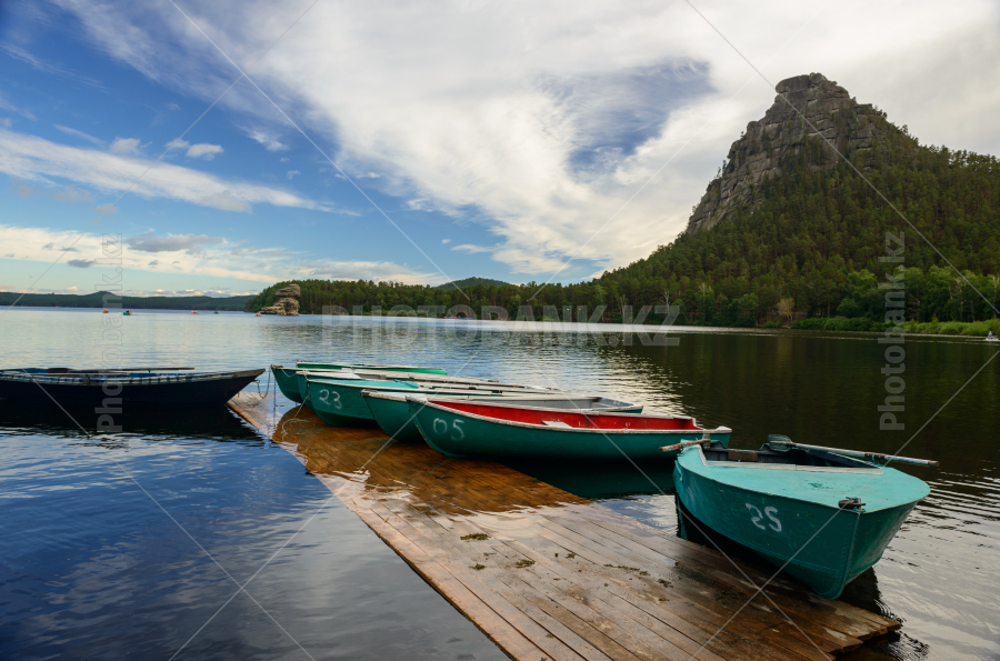 Borovoe lake. "Okzhetpes" rock and "Zhumbaktas" island. National park Burabay. Kazakhstan.