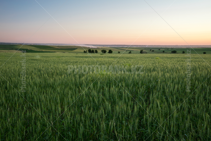 The field of unripe wheat at sunset. South Kazakhstan
