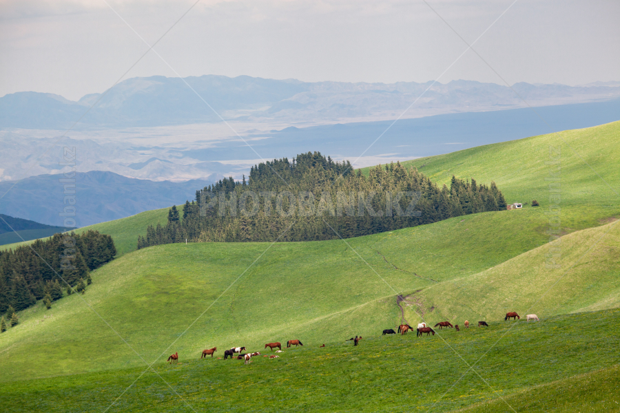 Табун лошадей пасётся на горном плато Ушконыр в Алматинской области.